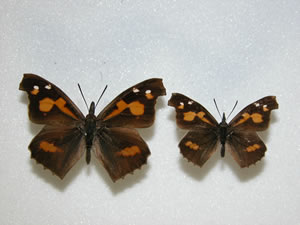 | 個体変異というと、季節型や地域型なども含まれるわけですが、ここでは個体差と異常型について見てみましょう。人間でも、同じ日本人で同じところに住んでいてもだれ一人として同じ顔がないように、蝶なども斑紋(翅の模様)や大きさなど個々に違いがあります。微妙な斑紋の違い程度の「個体差」から、外的因子、遺伝的、遺伝子の異常などによる「異常型」までさまざまです。 何処までが個体差で、何処からが異常型と呼ぶのかは、個人の見解で多少変わってきます。 |