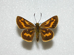 | コチャバネセセリ セセリ蝶といえば、一般の人から見れば形態的に「蛾」というイメージが強いと思いますが、日本では蝶の仲間として扱っています。確かに分類上蝶に近いのですが、専門家によって「蝶でもなく、蛾でもない」は特異な系統に扱うことがあります。 コチャバネセセリは以前はよく見られた蝶なのですが最近はとても少なくなったよう思います。幼虫はイネ科のササ類を食べるため、そのような環境が少なくなっているのでね。 |