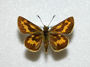 | イチモンジセセリ この蝶は移動性の高い蝶で、名古屋でもお盆ごろまではあまり見かけないのですが、それ以後住宅地でも多く見られるようになります。南方より世代を繰り返しながら北上し、北海道まで到達してしまいます。北日本では寒さに耐えることが出来ず。全てが滅びてしまい、また翌年南方より北上するのです。 |