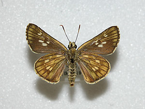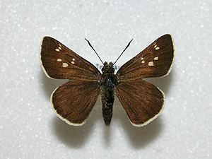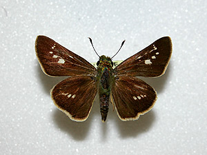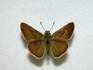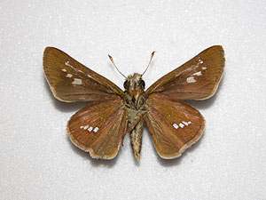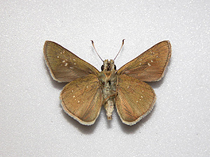 | チャタマダラセセリ 夏過ぎから家庭菜園や雑木林の周辺で多く見られるようになる蝶ですが、こちらも年々少なくなってきています。 |